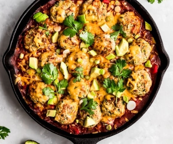 Ingredients To garnish: Instructions Source: https://www.ambitiouskitchen.com/one-pan-enchilada-zucchini-turkey-meatballs-and-rice/