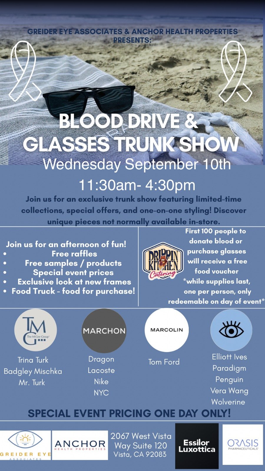 Blood Drive & Glasses Trunk Show on Wednesday, September 10th at Greider Eye. Come donate blood, browse an awesome selection of frames …
