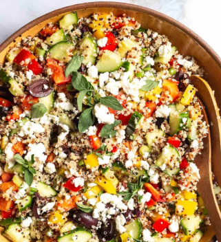 - While the quinoa cools, chop the vegetables, adding them to the quinoa as you go. Trim and slice the scallions, chop the peppers, and run your knife across the olives to break them into smaller pieces. Slice the cucumber in half, then into quarters, and slice. Add the bowl and stir. Finish with feta and serve. You can dress it up by garnishing it with fresh oregano leaves, but that’s entirely optional.